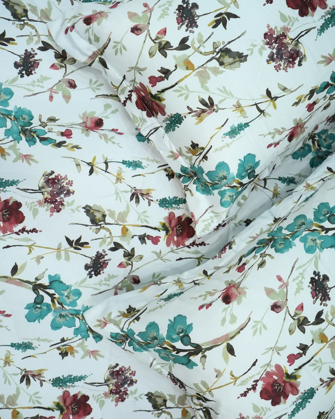 Teal flowers, maroon buds, soft pink blossoms, and fine brown branches scattered freely across a clean white base. The spacing between the florals gives it breathing room — it doesn’t feel packed or busy. A bedsheet that adds colour to a neutral room without taking over. Matching pillow covers included.