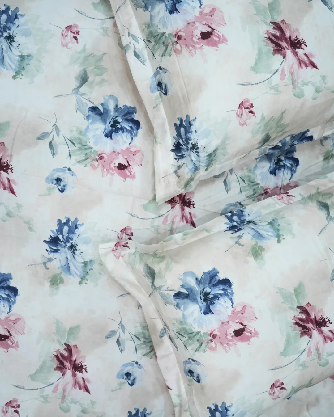 Loose watercolour florals in blue, dusty pink, and maroon on a warm cream base. The print has that unfinished, painterly quality — petals bleed softly into the background. Not a sharp, rigid print. It feels gentle. Matching pillow covers included.