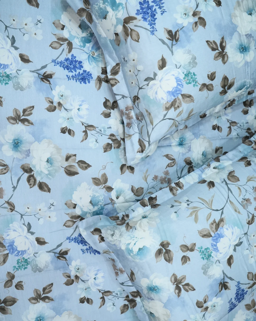The Blue Hydrangea is a 100% cotton digital bedsheet — soft blue base with scattered white flowers and brown leaves. A calm, easy design that works year-round. Manufactured at Vardhman Mills, Suratgarh, since 1983.