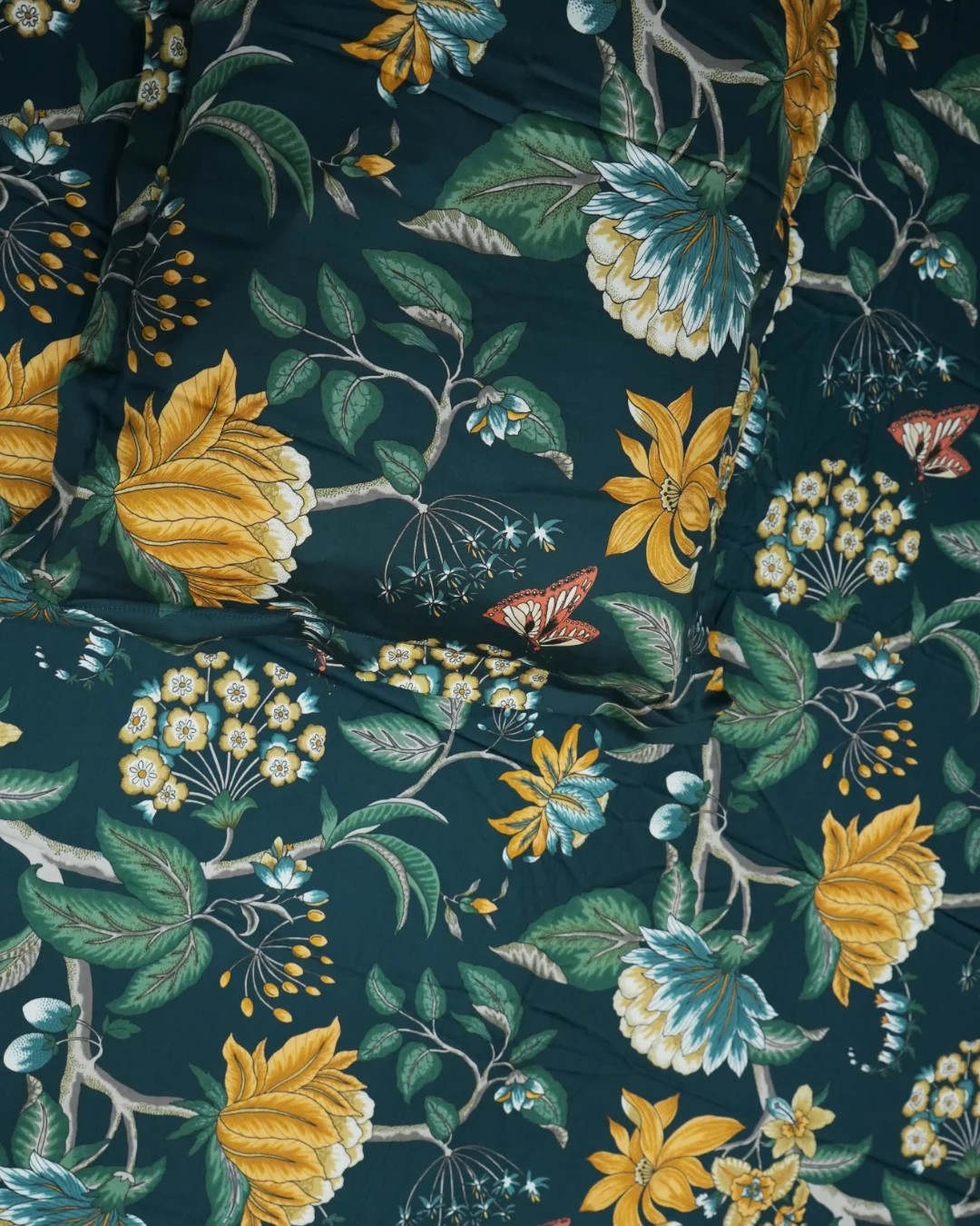 Unlike traditional screen printing, digital printing technology allows for incredibly detailed, photo-realistic designs with vibrant colours that won’t fade easily. The Emerald Botanical pattern features an enchanting garden scene with large golden blooms, turquoise florals, lush green foliage, and delicate butterflies against a rich teal base. Every detail is crisp and clear – from the intricate leaf veins to the butterfly wings.