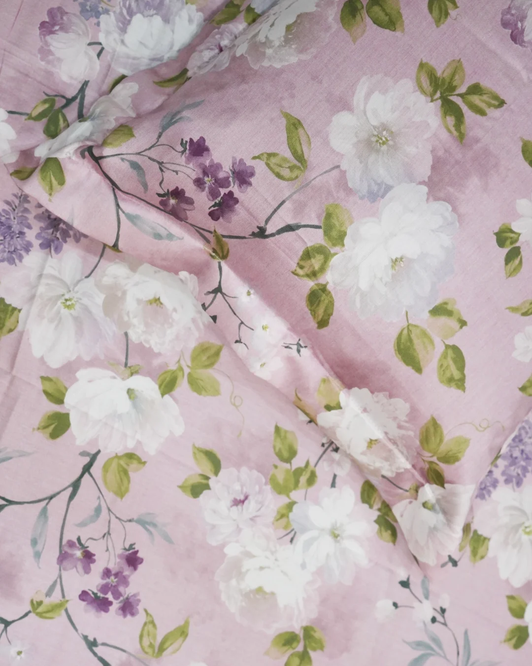 Transform your bedroom with this romantic digital print bedsheet featuring a beautiful pink peony design. Crafted from 100% premium cotton with 300 thread count, this digital bedsheet set includes matching pillow covers. The soft dusty pink base with white peonies and purple blooms creates a dreamy, elegant look for any bedroom. Available in Double (90×100″) and King (108×108″) sizes.