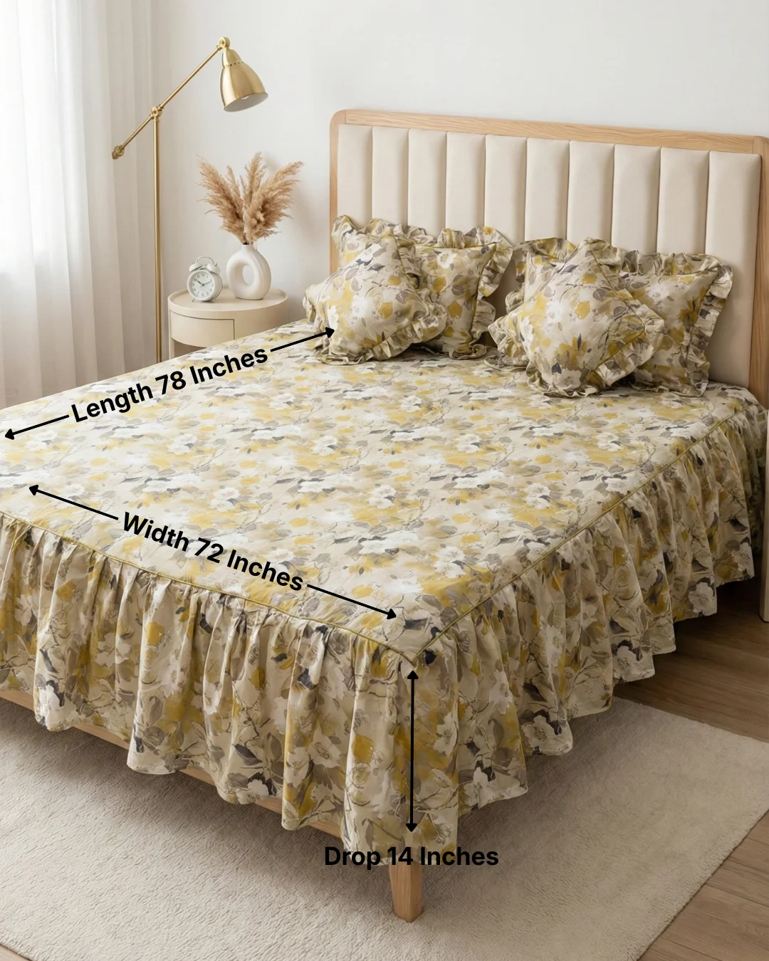 If you’re searching for a cotton frill bedsheet that brings cheerful warmth to your bedroom, this Sunlit Garden design is the perfect choice. This king size frilled bedsheet set from Vardhman Mills delivers premium quality backed by 40+ years of textile manufacturing expertise.