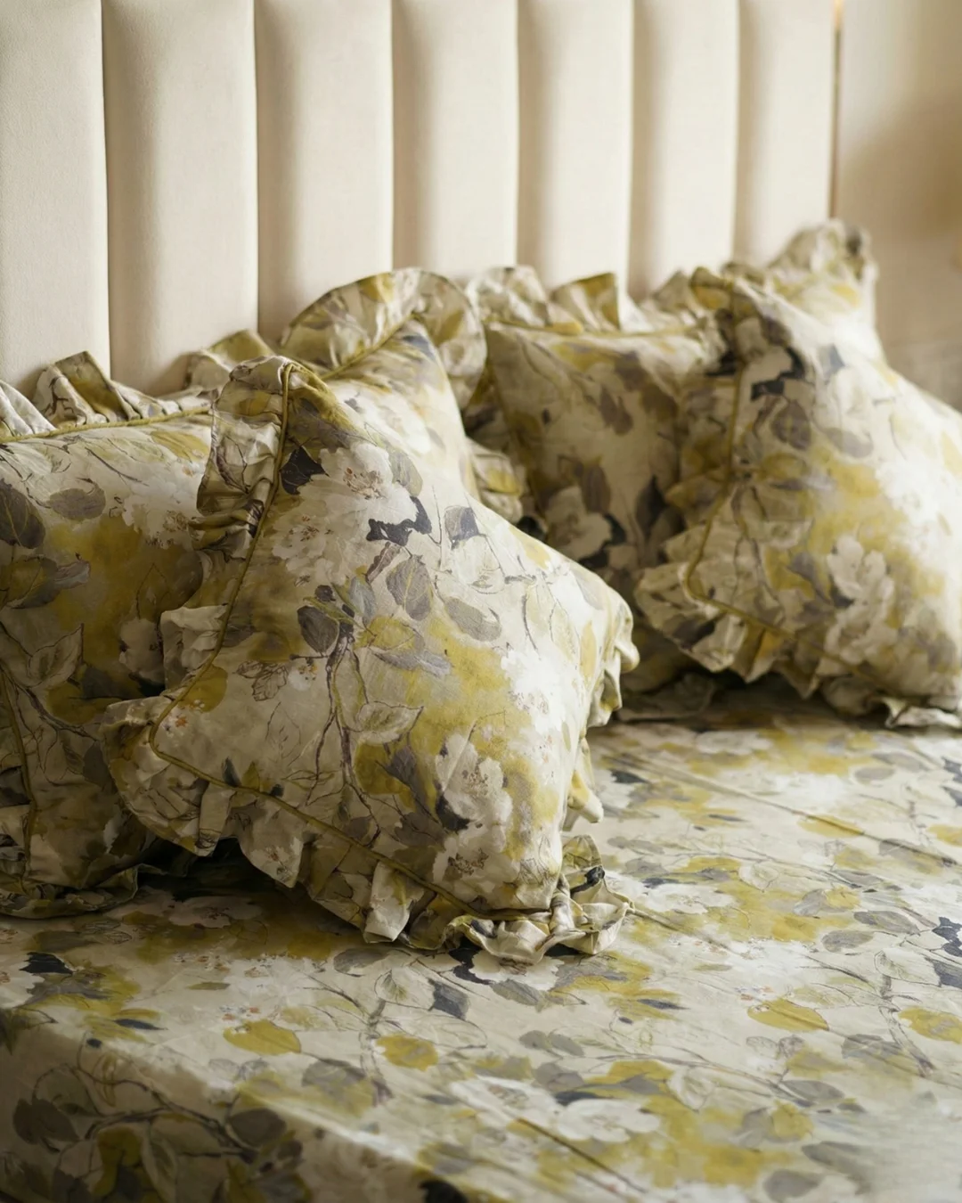 The Sunlit Garden design features beautiful blooming florals in sunny yellow, olive green, and soft grey tones on a warm cream base. This garden-inspired pattern creates a bright, uplifting atmosphere in your bedroom – perfect for those who love nature-inspired decor. The attached 14-inch gathered frill skirt adds a charming, decorator-styled finish that transforms any bed into a welcoming retreat.