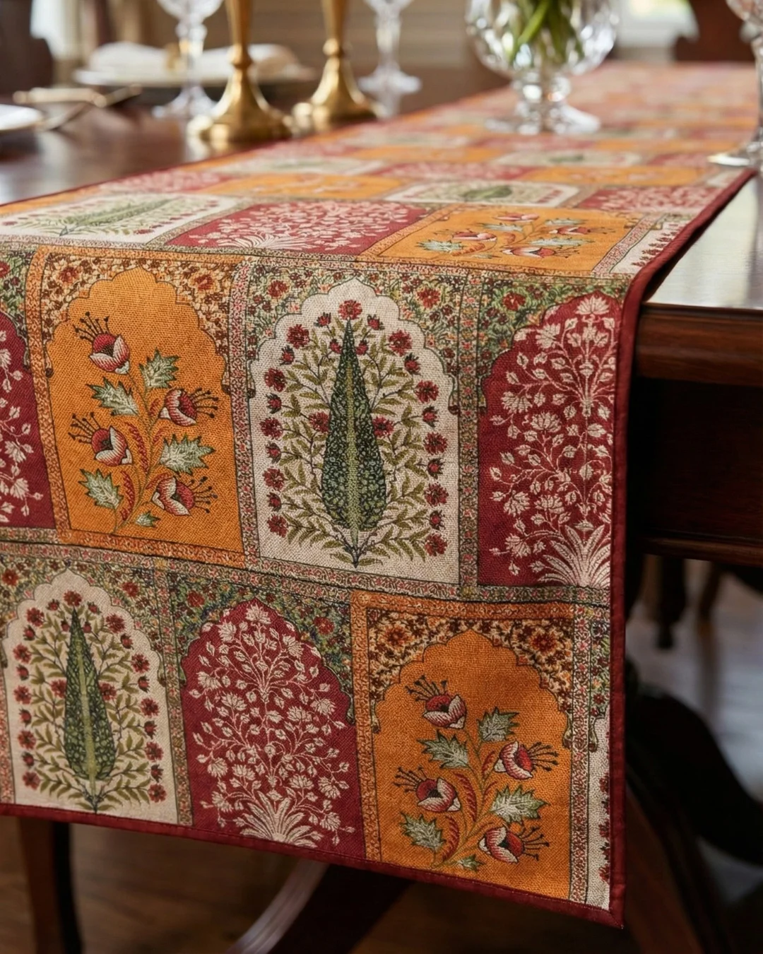 This Mughal-inspired table runner features a patch-style layout composed of floral panels and tree motifs influenced by traditional Indian block print aesthetics. Each square panel is framed with fine detailing, creating a structured yet visually rich pattern. The repeating floral elements add warmth and character to the table while keeping the overall look balanced.