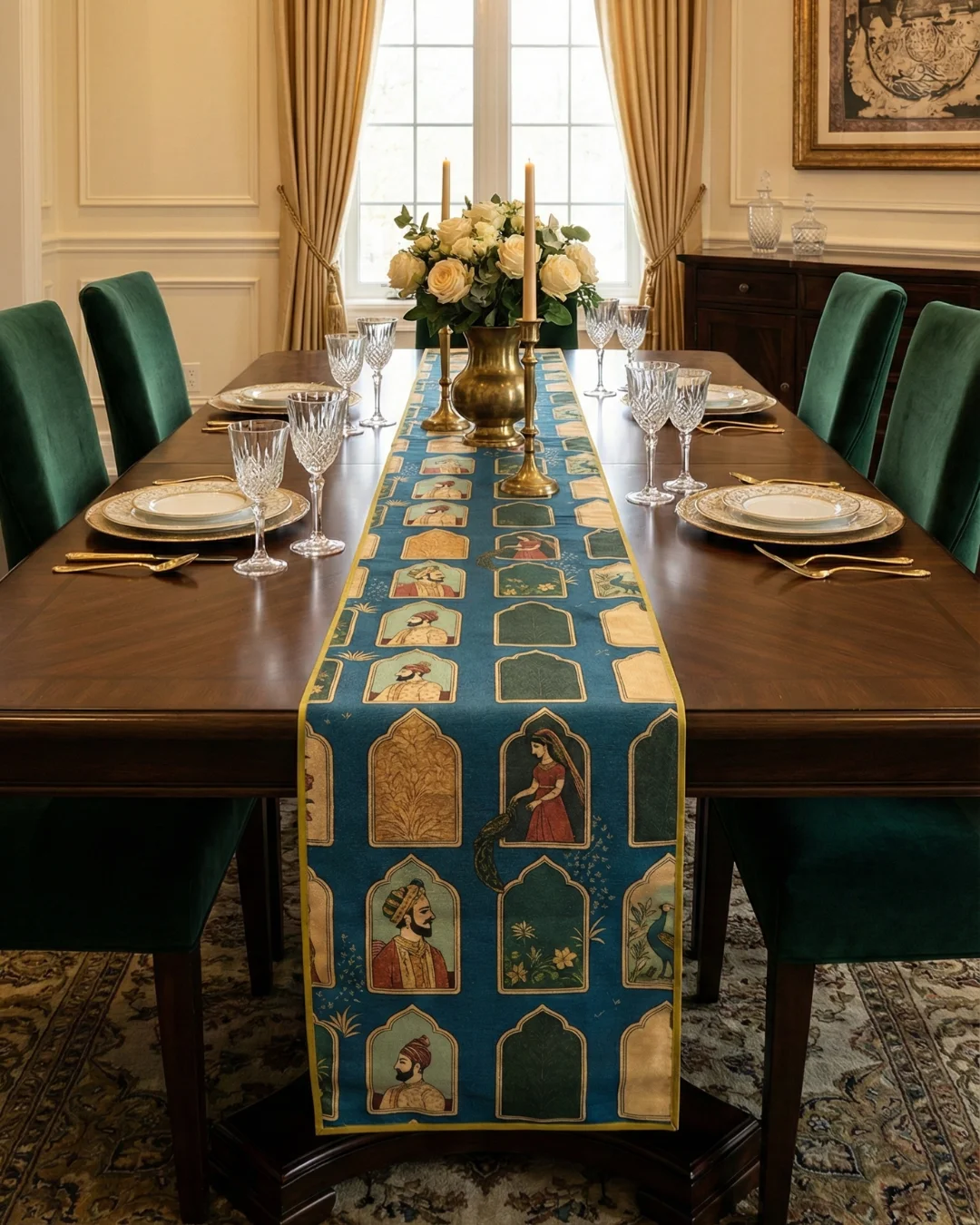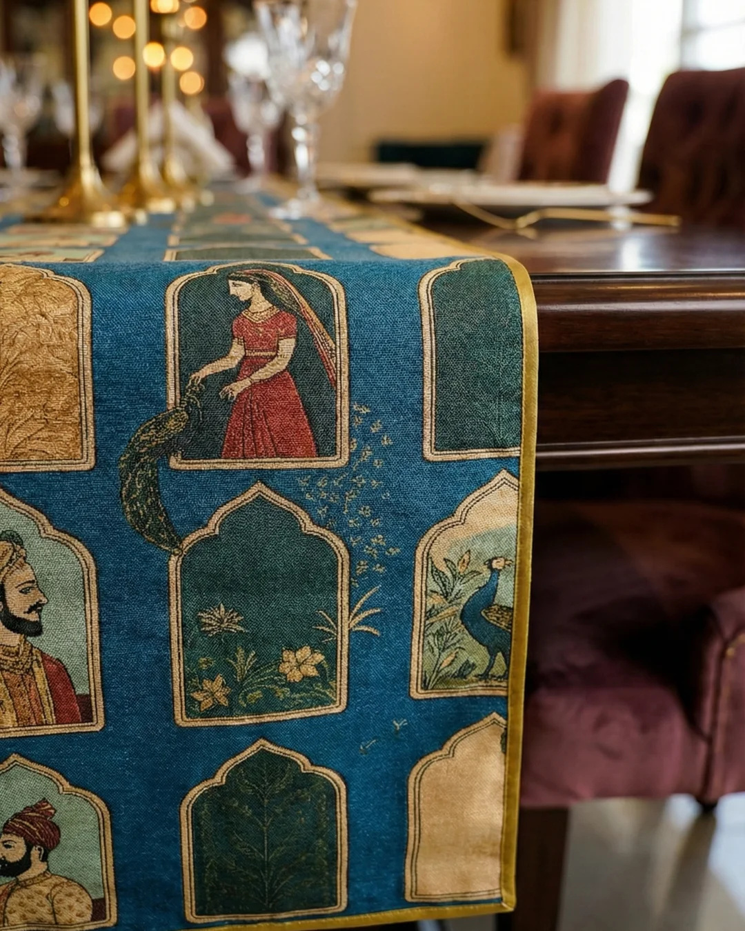 The runner is made from textured silk fabric that gives it a rich, layered feel without being too heavy. The digital printing process keeps every detail sharp — from the fine jewellery on the court figures to the feathers of the peacock. The colour palette of deep teal, gold, and earthy tones works well with both dark wood and light-coloured dining tables.