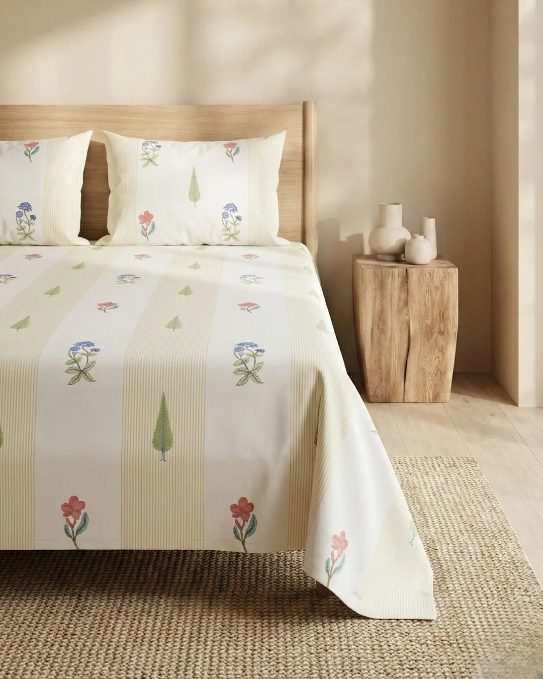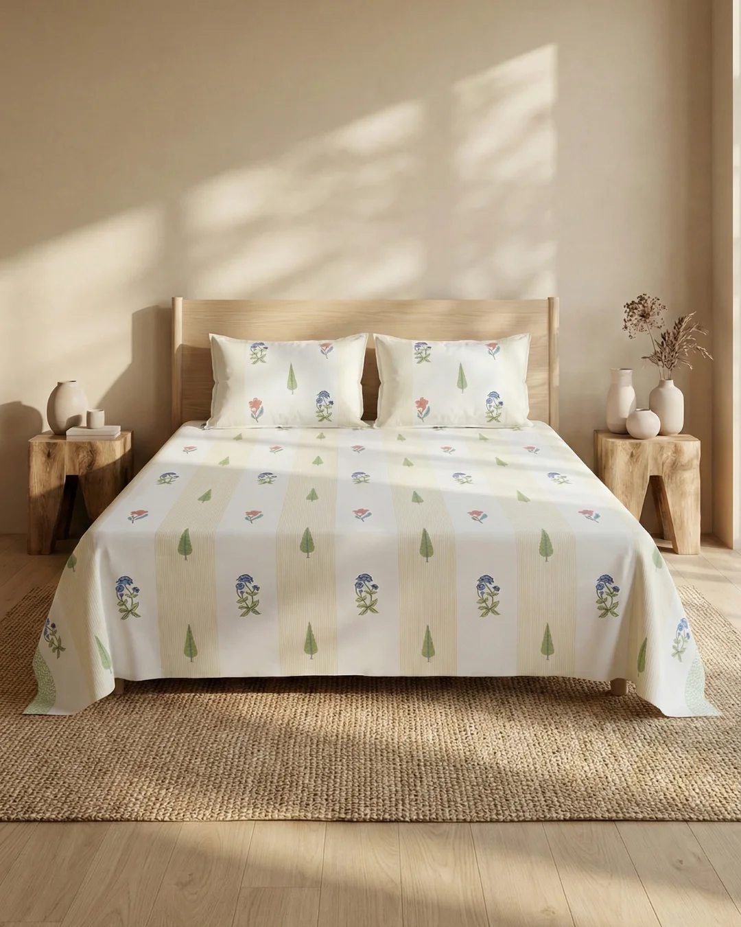 Looking for an authentic multi floral stripe hand block print cotton bedsheet? This handcrafted bedsheet brings traditional Rajasthani craftsmanship to your bedroom with charming floral motifs and subtle stripes on a warm cream base.