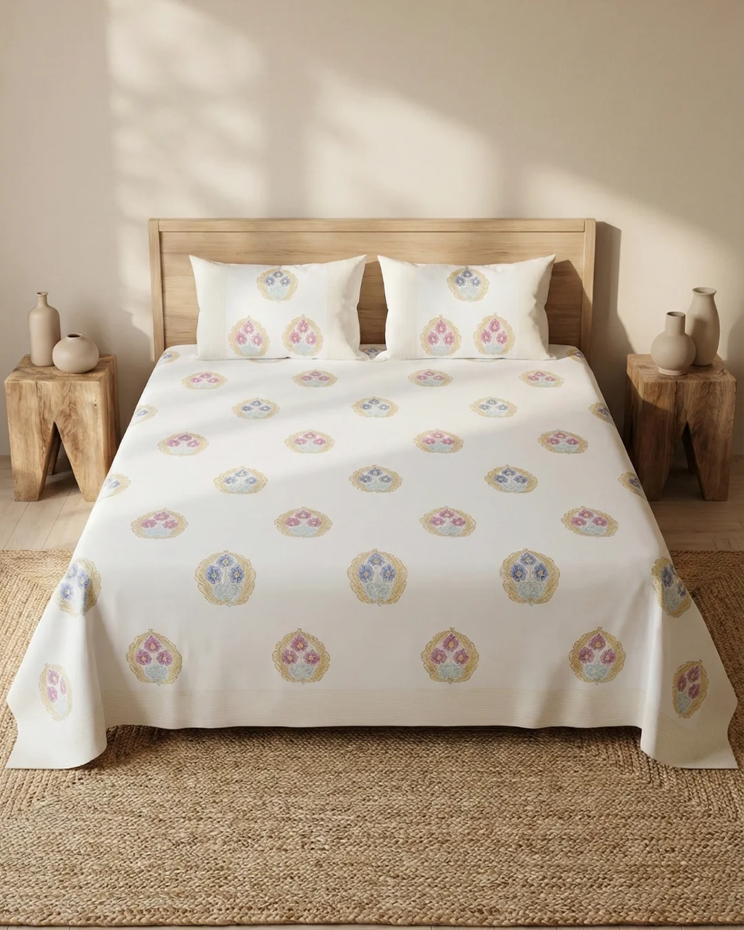 Pastel Floral Medallion Hand Block Print Cotton Bedsheet – Traditional Rajasthani Elegance