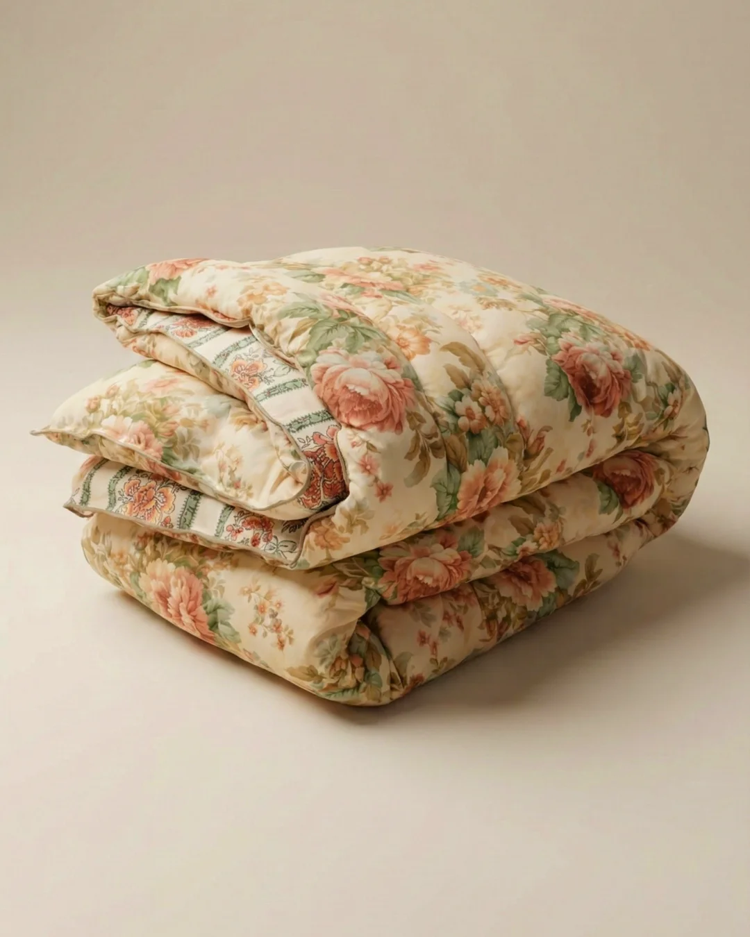 The warm sand base features a timeless heritage pattern with coral and peach roses complemented by soft green foliage. A decorative floral border adds an elegant finishing touch. The digital print stays vibrant and colourfast — no fading even after multiple washes.