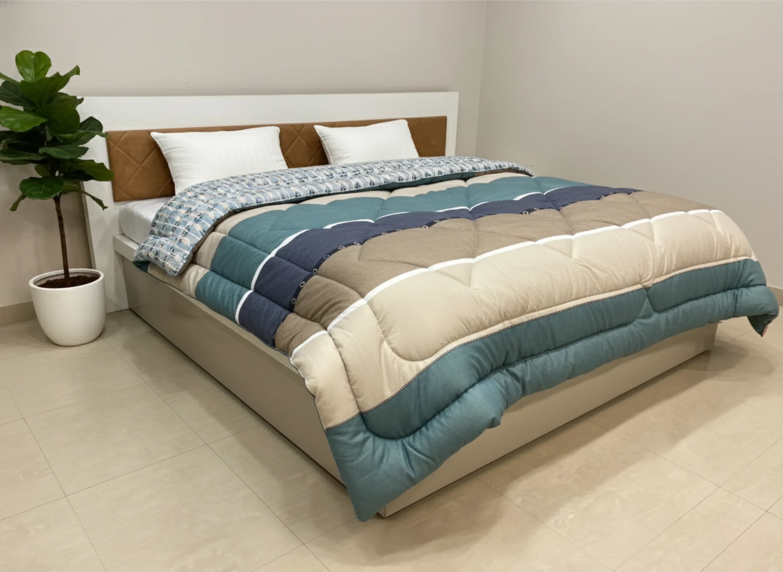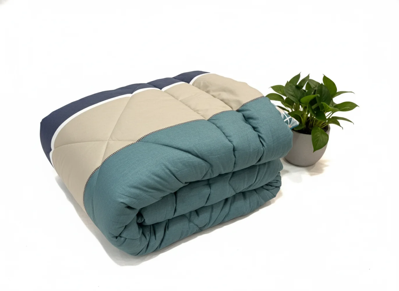 Experience ultimate winter warmth with the Teal Striped Heavy Winter Quilt (Rajai) from our Feather Touch collection. Featuring clean horizontal color block stripes in teal, navy, and beige tones, this 4.5kg heavy-fill rajai delivers exceptional warmth for cold winter nights.