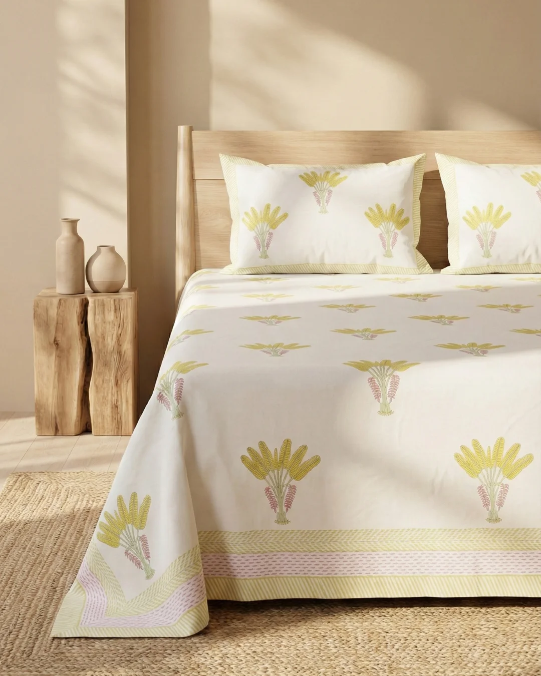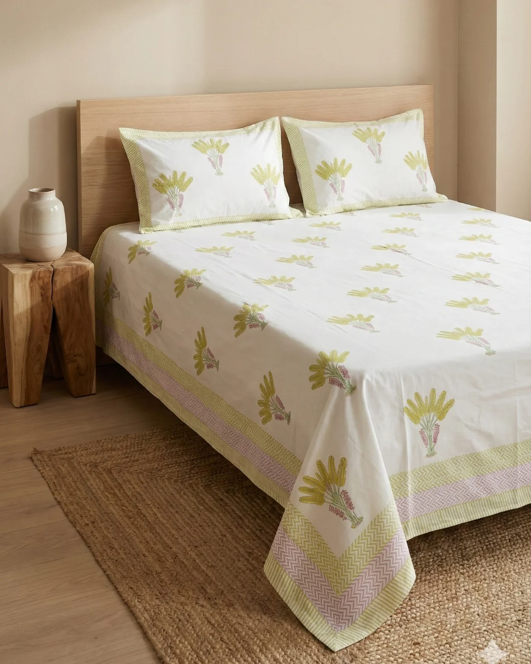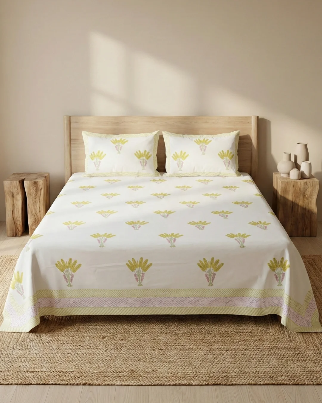 Looking for an authentic yellow floral bouquet hand block print cotton bedsheet? This handcrafted bedsheet brings traditional Rajasthani craftsmanship to your bedroom with elegant bouquet motifs on a crisp white base.